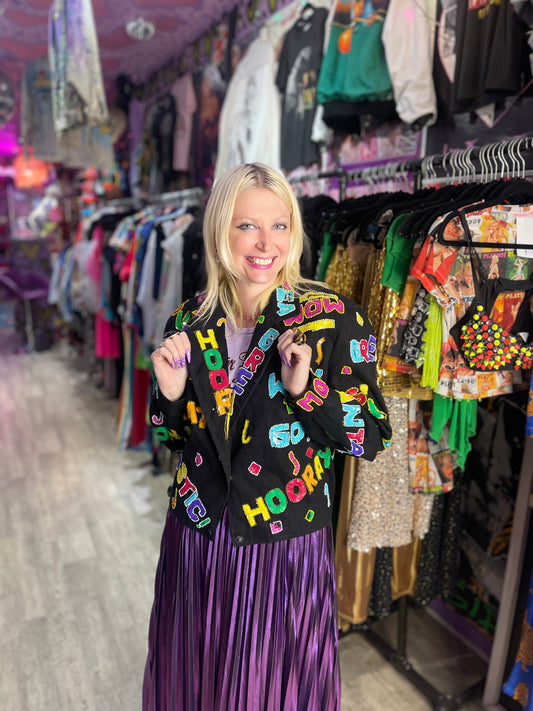 Vintage 90s Sequin News Words Bomber Denim Jacket