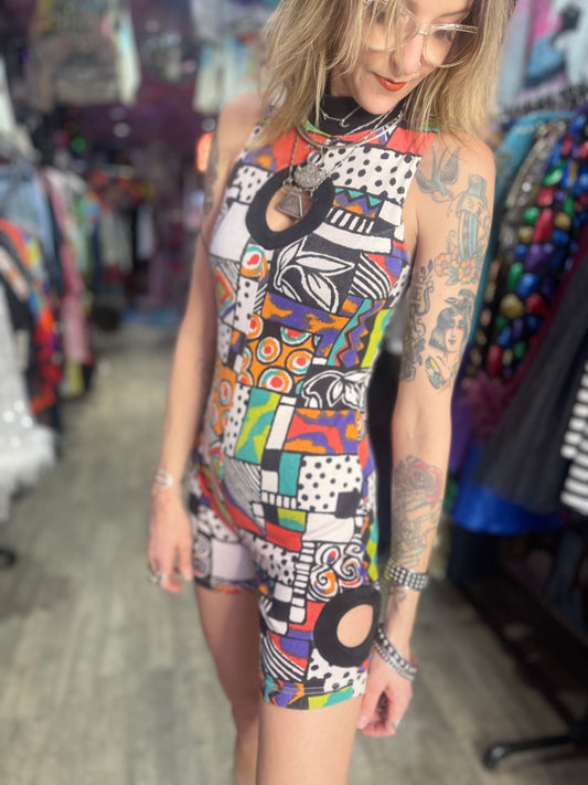 Vintage 90’s Color Block Cut Out Bike Short Romper