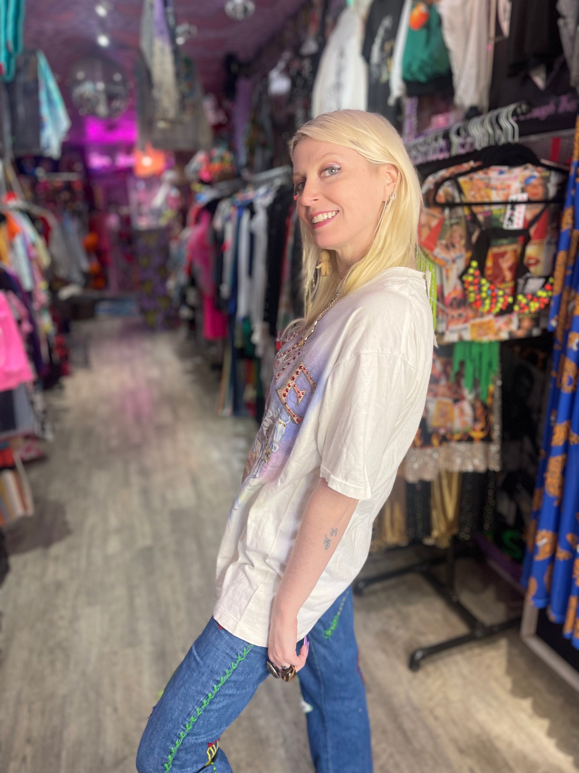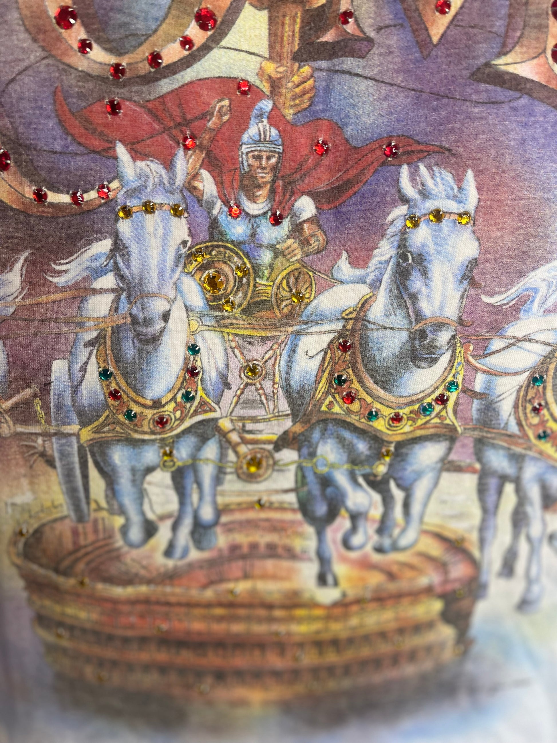 Super rare custom made designer tee! Has airbrushed image of a Horse drawn chariot with the Colosseum. Reads “Rome” with bedazzled red gem stones throughout. Dated 1987 Alamo designs