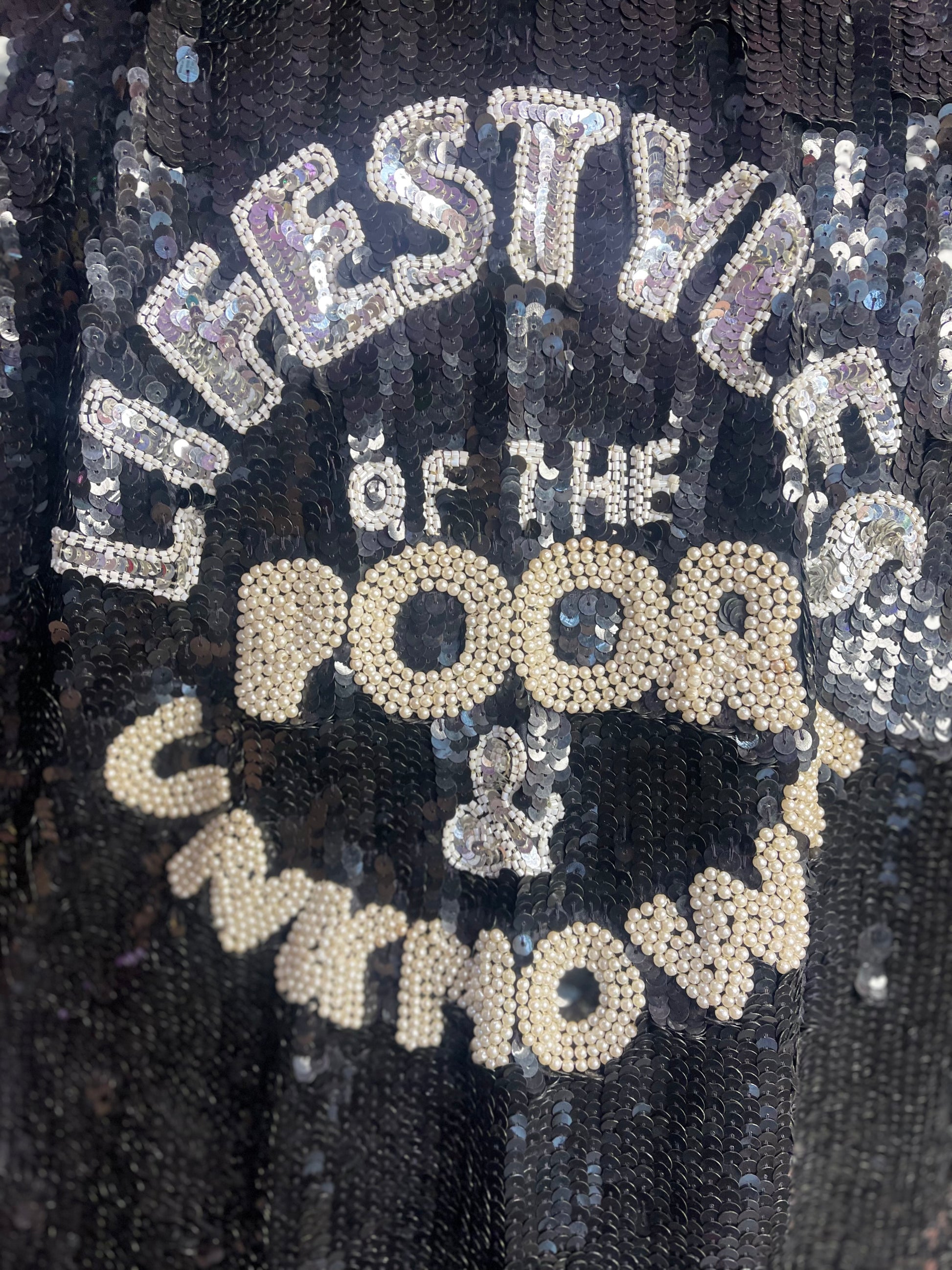 Fabulous and opulent 80s/90s vintage jacket. Bomber style zip up. Completely sparkly encrusted with black sequins! Back reads “Lifestyles of the Poor and Unknown” a play on words from the old tv show “Lifestyles of the Rich and Famous” True statement wear! Never seen another like it’