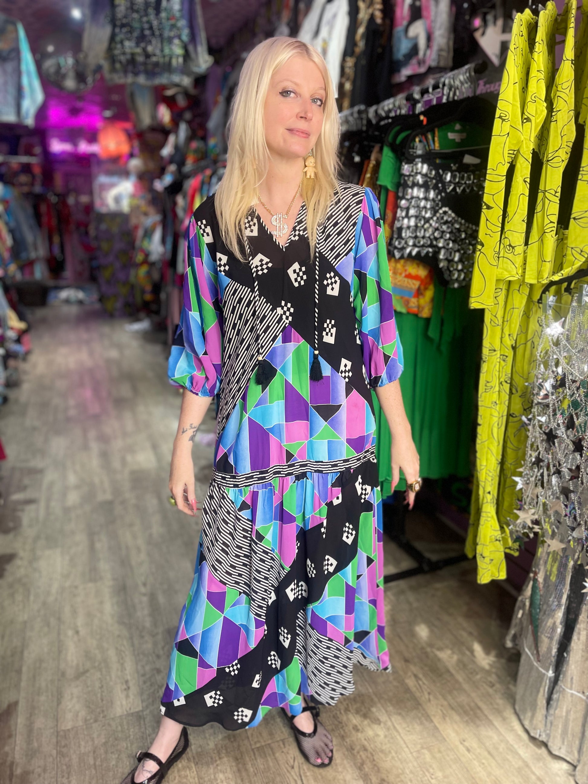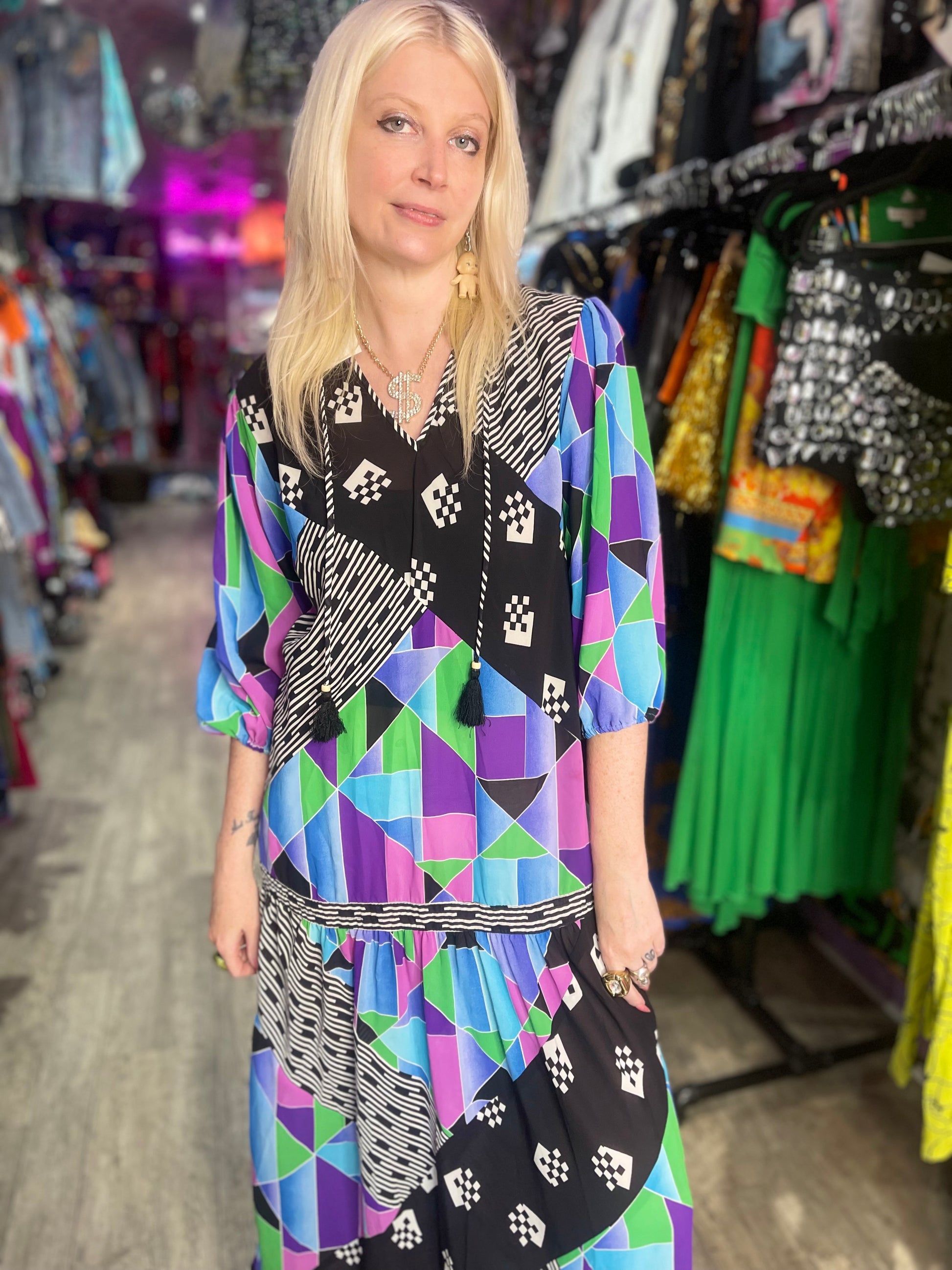 Amazing 80s semi Sheer maxi dress. Drop waist style with flowy poet sleeves. Decorative tasse tie around neckline . Allover colorful geometric print