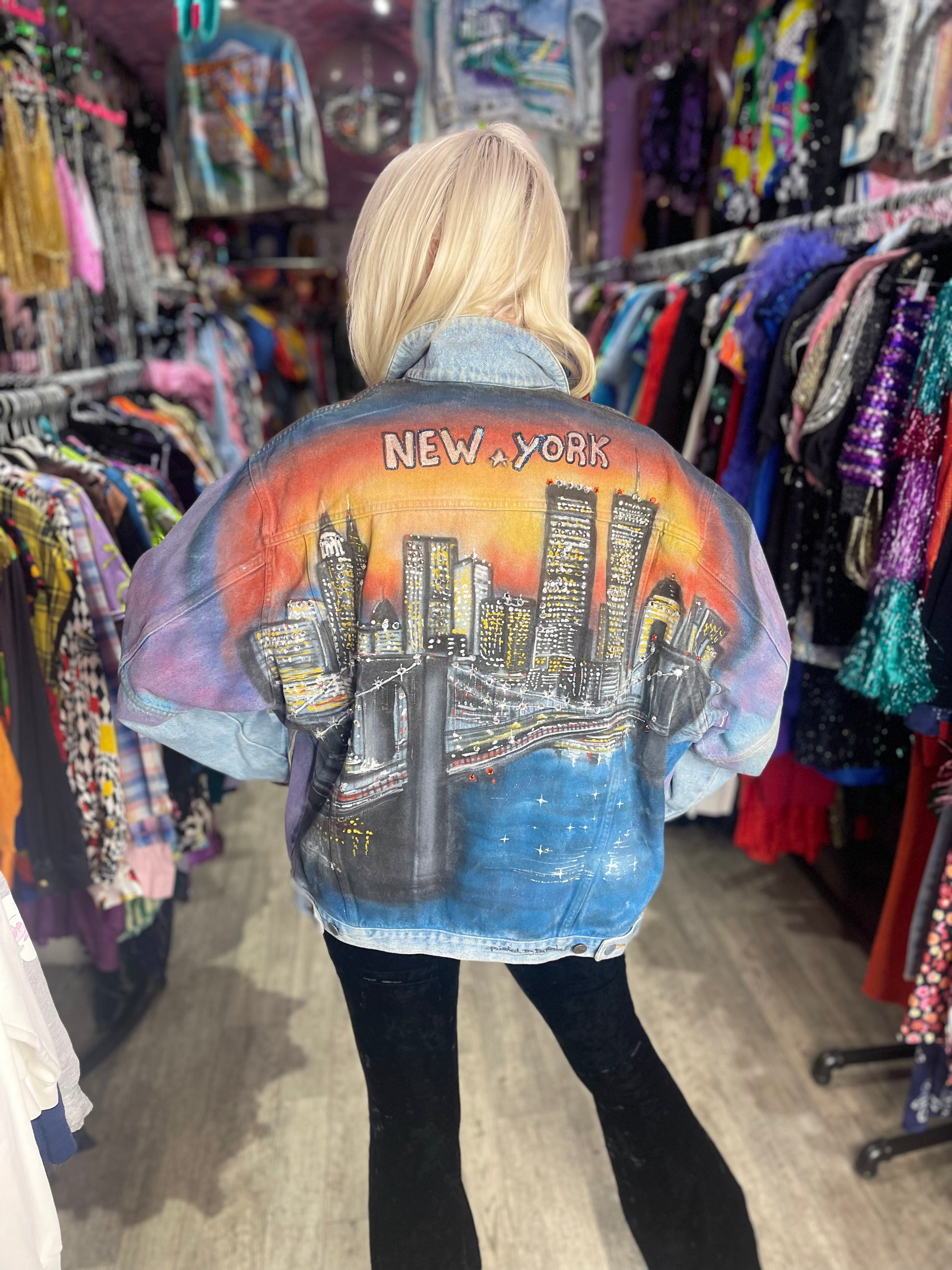 Epic customized Jean Jacket! Medium wash denim with Allover painted NYC skyline theme including the twin towers. Has sparkly accents throughout annd rhinestone details ..Epic!