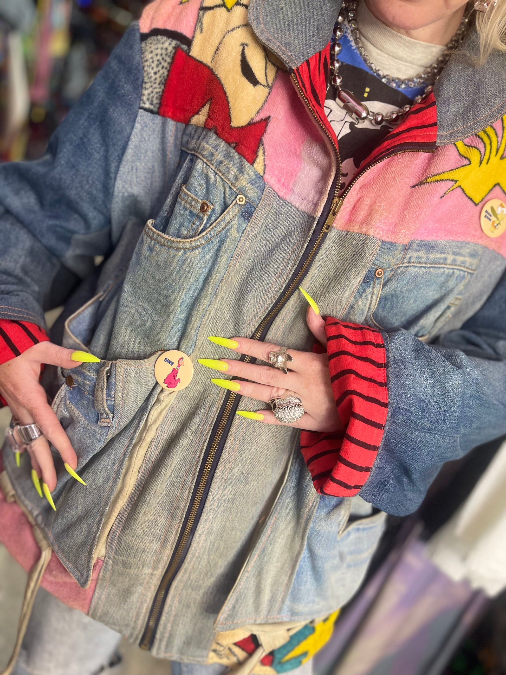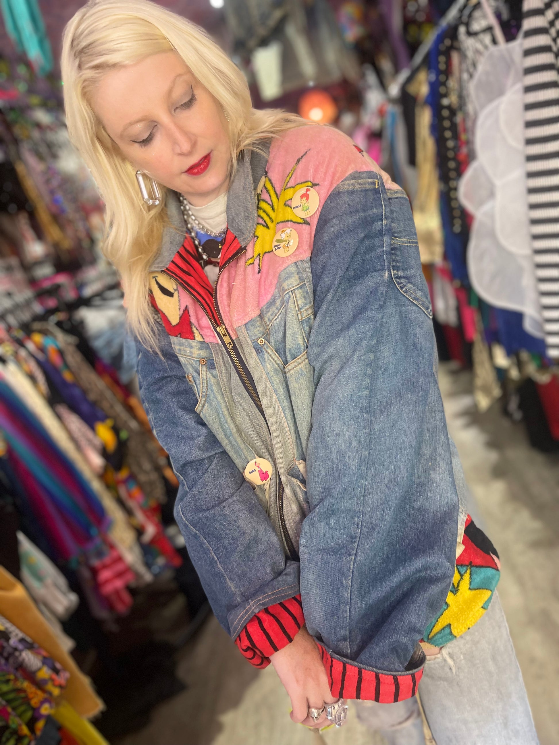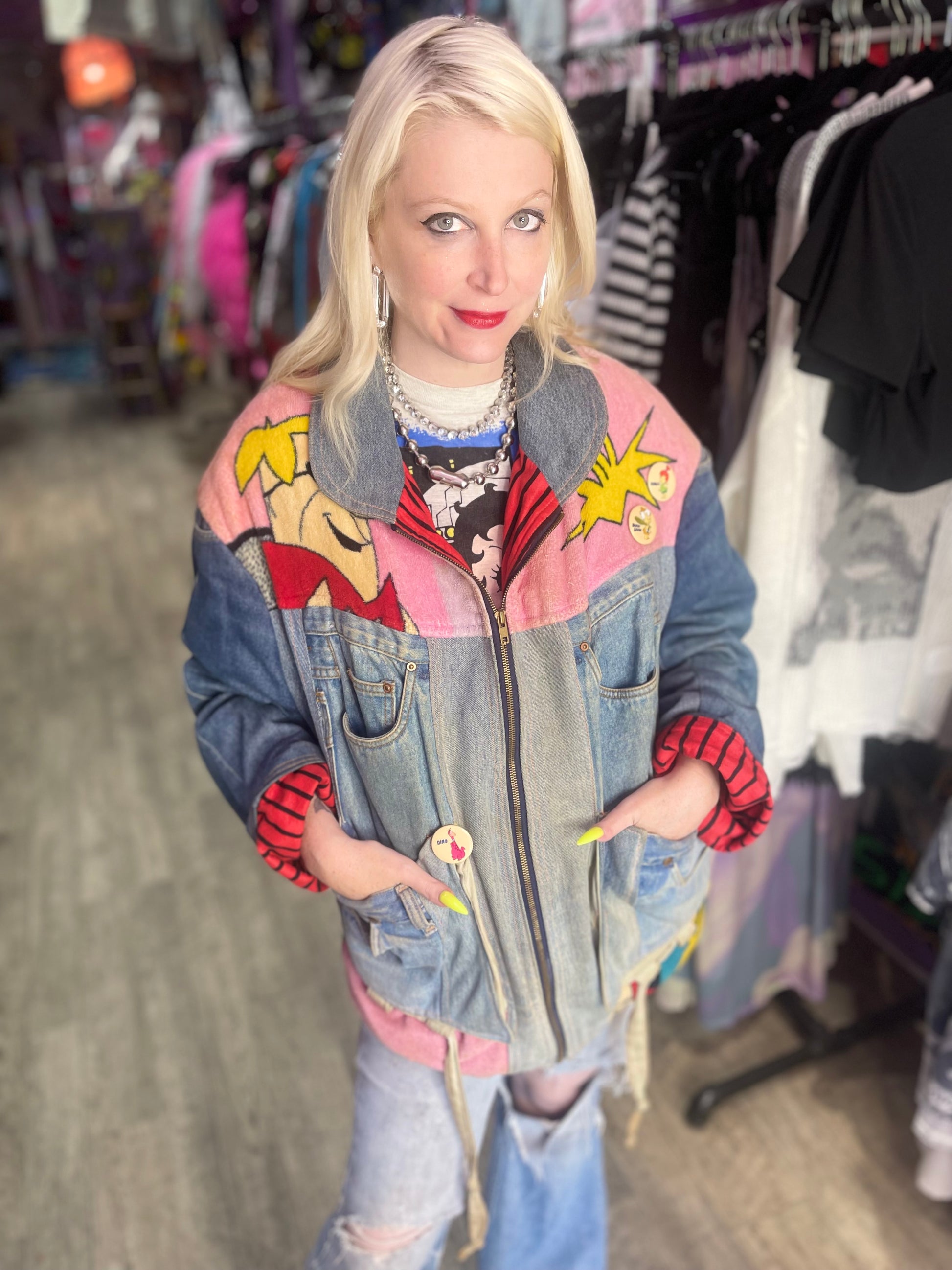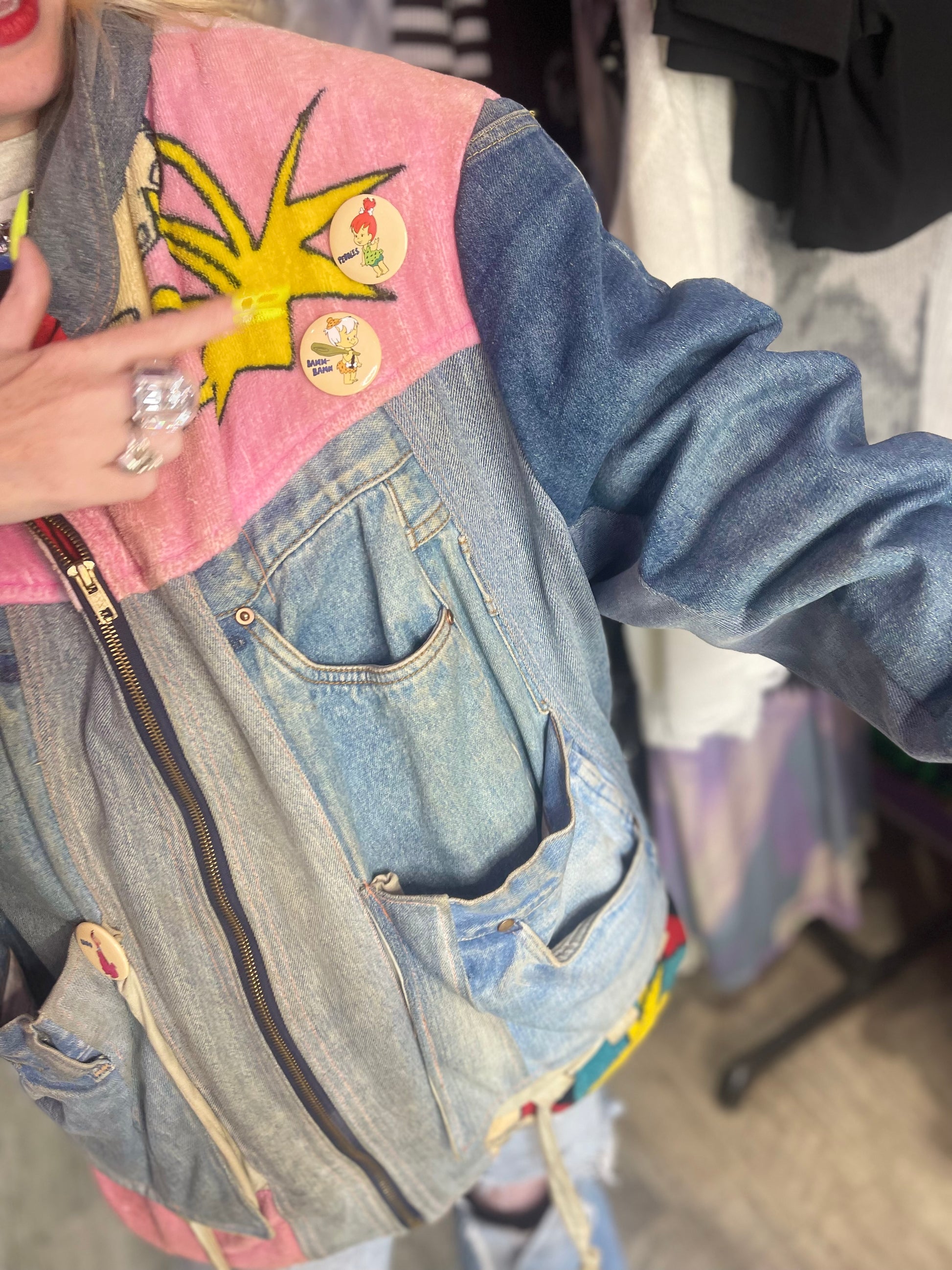 Incredibly rare designer 80s patchwork jean jacket. Medium wash patched denim with terry cloth fabric of a rockin Fred Flinstone on back. Zip Up and Oversized fit! No other like it! Denim and terry cloth has minimum signs of fade/wear. Looks cool. Striped lining and vintage pins on Dino, BamBam and Pebbles throughout.