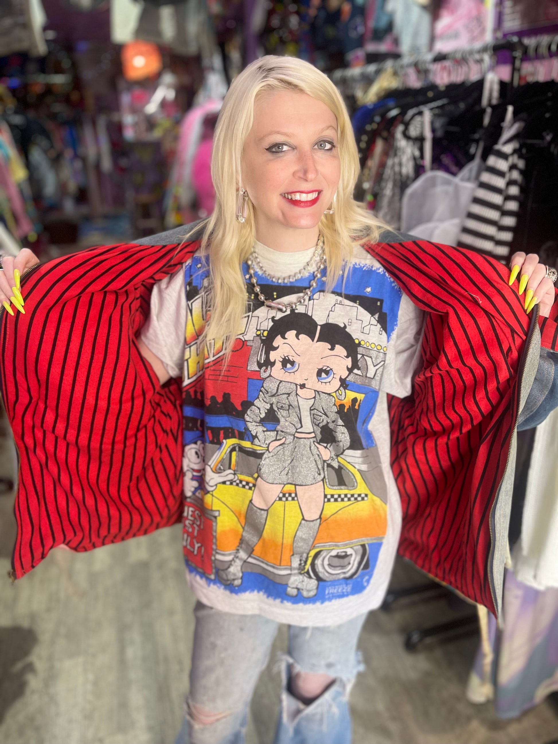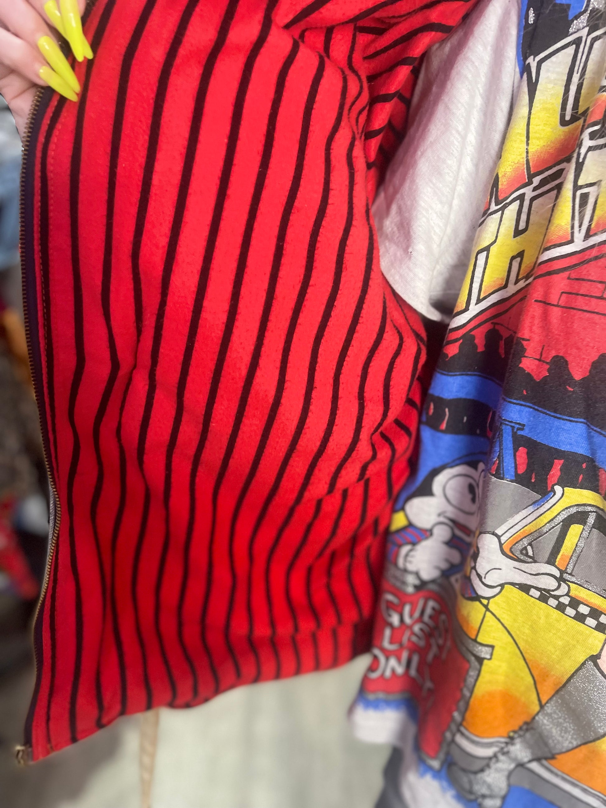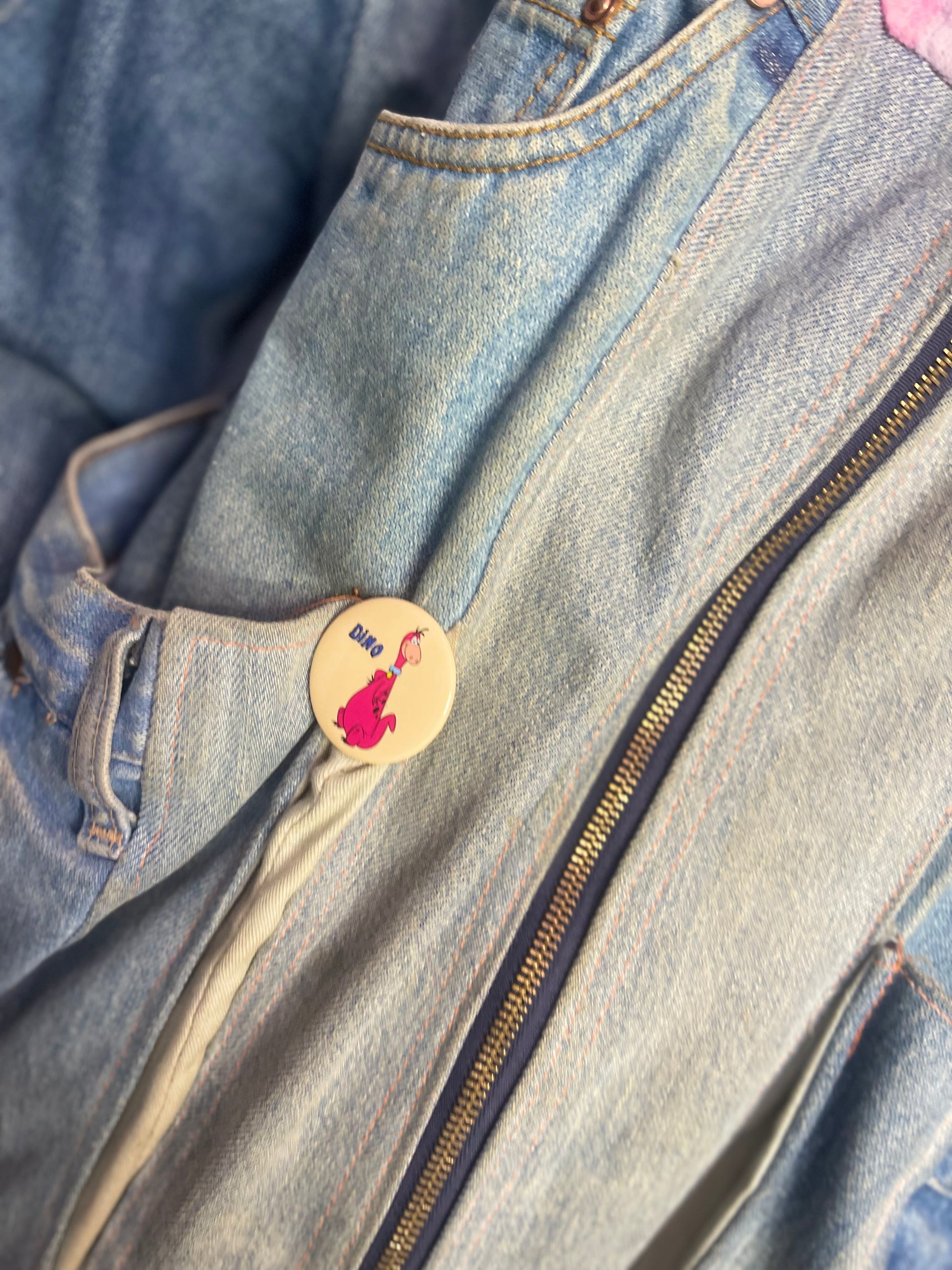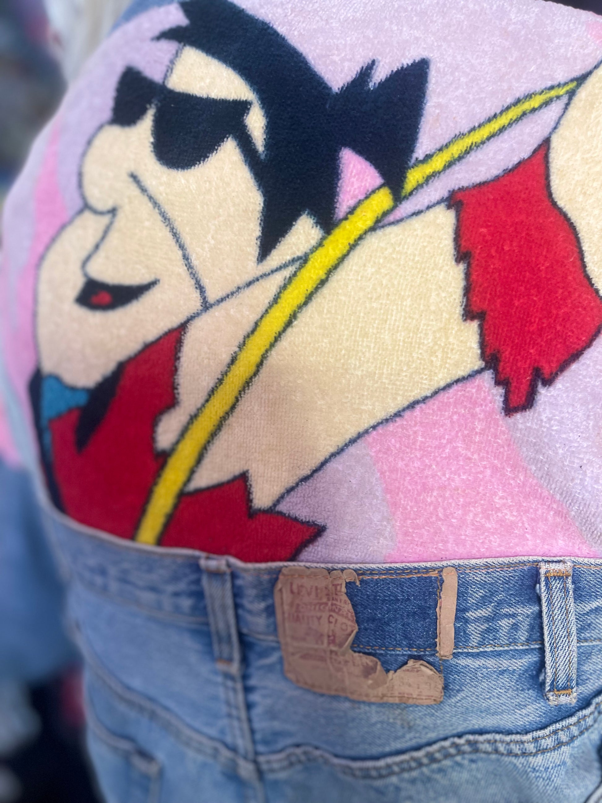 Incredibly rare designer 80s patchwork jean jacket. Medium wash patched denim with terry cloth fabric of a rockin Fred Flinstone on back. Zip Up and Oversized fit! No other like it! Denim and terry cloth has minimum signs of fade/wear. Looks cool. Striped lining and vintage pins on Dino, BamBam and Pebbles throughout.