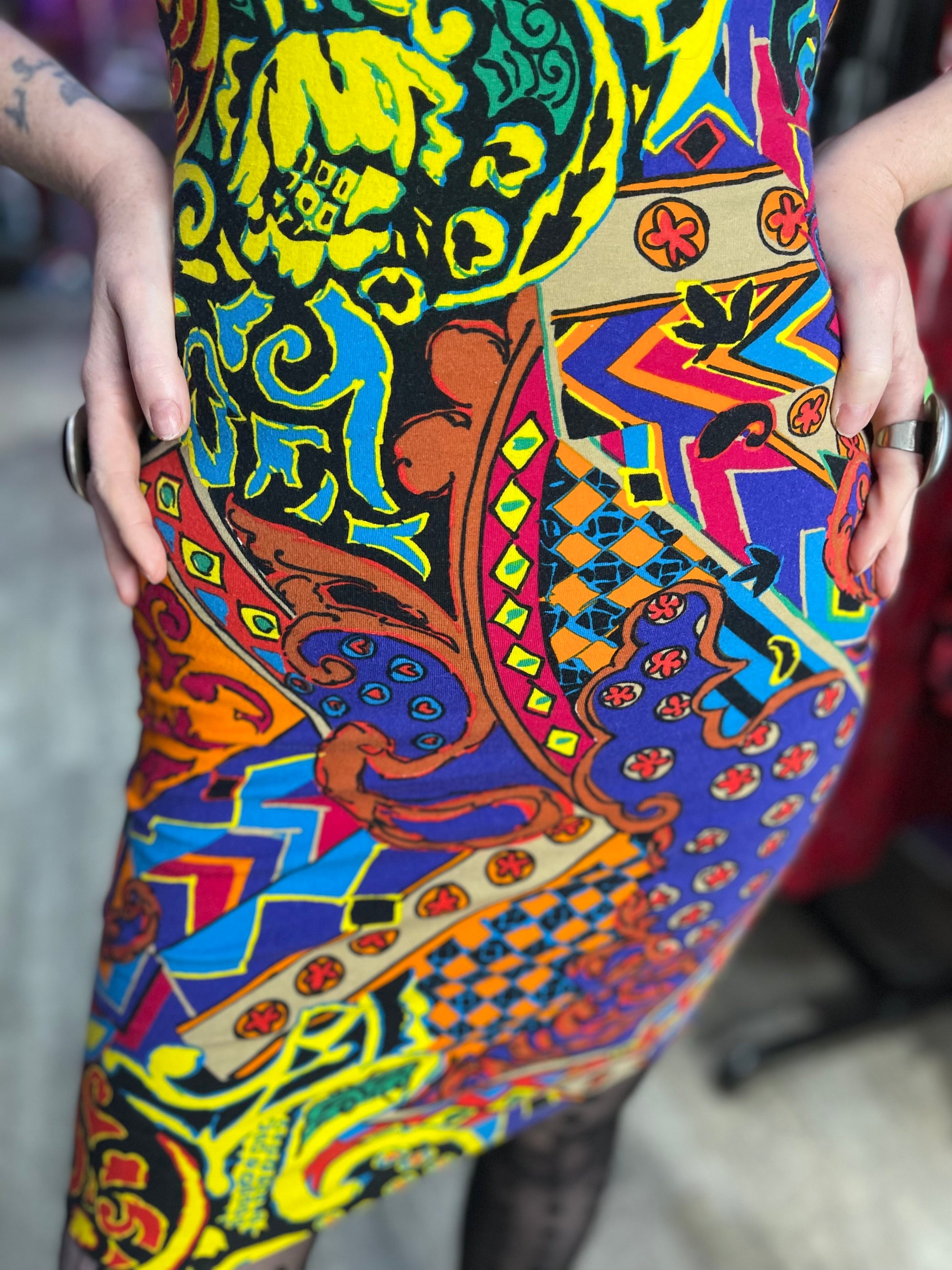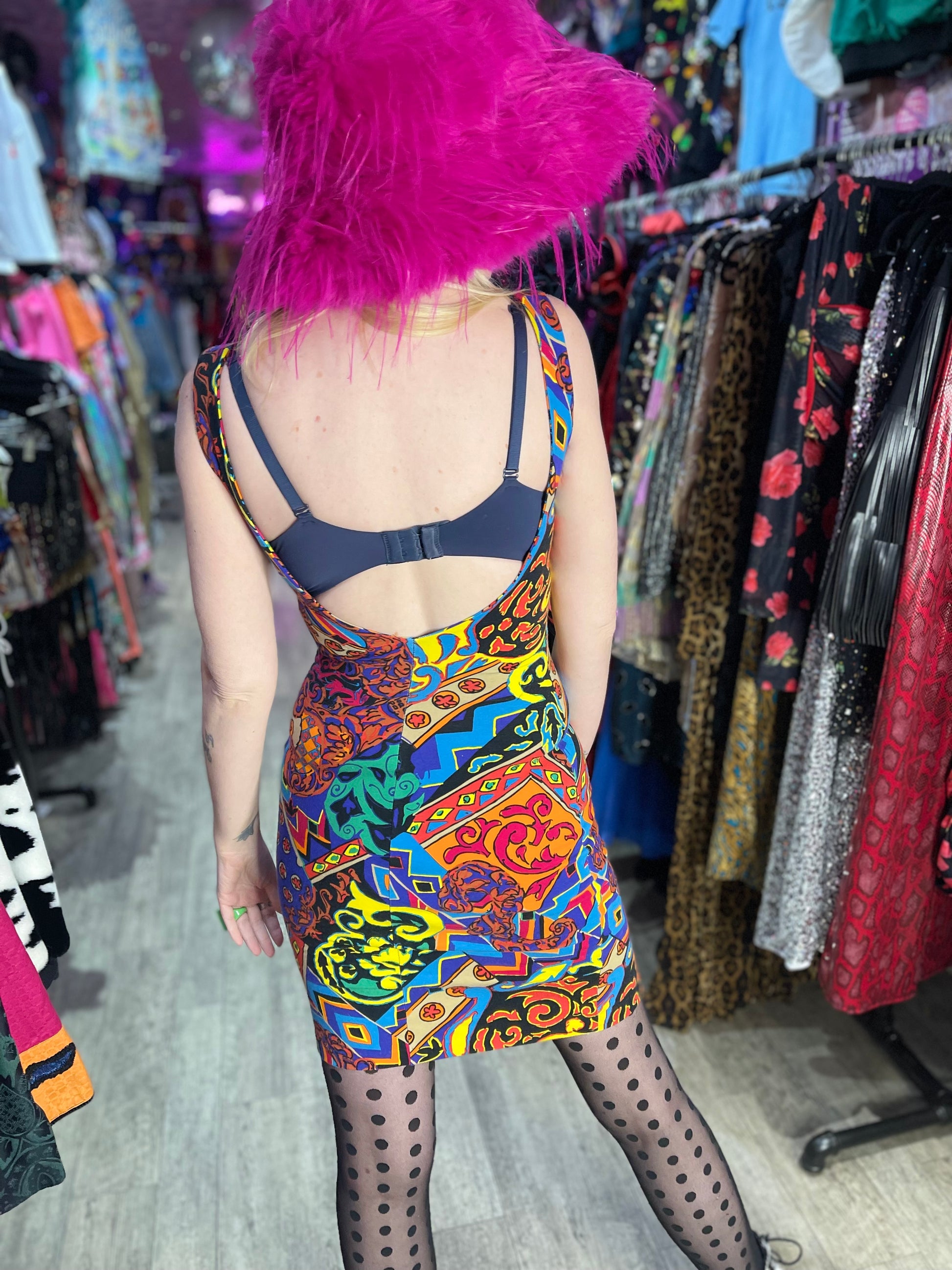 Amazing 80s era Designer Dress by Betsey Johnson! Classic Cotton Lycra blend, soft and very stretchy! Mid length, sleeveless, low back. Has Allover colorful status print motif. Iconic! Orginal Punk Label.