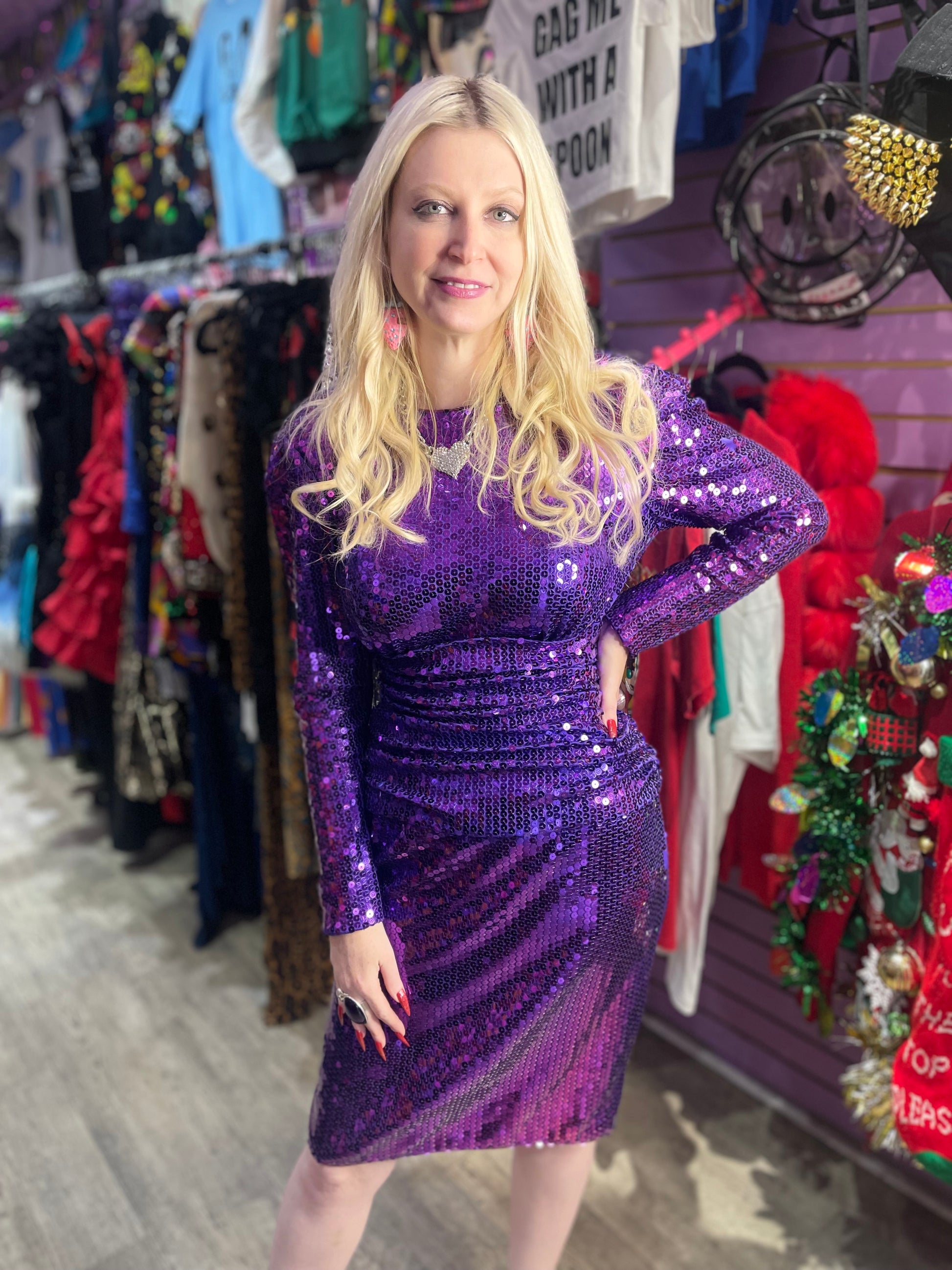 Gorgeous and Sexy 80s sequin midi dress. Allover purple sequin. Low back, zip up and decorative waistline. Very flattering silhouette!
