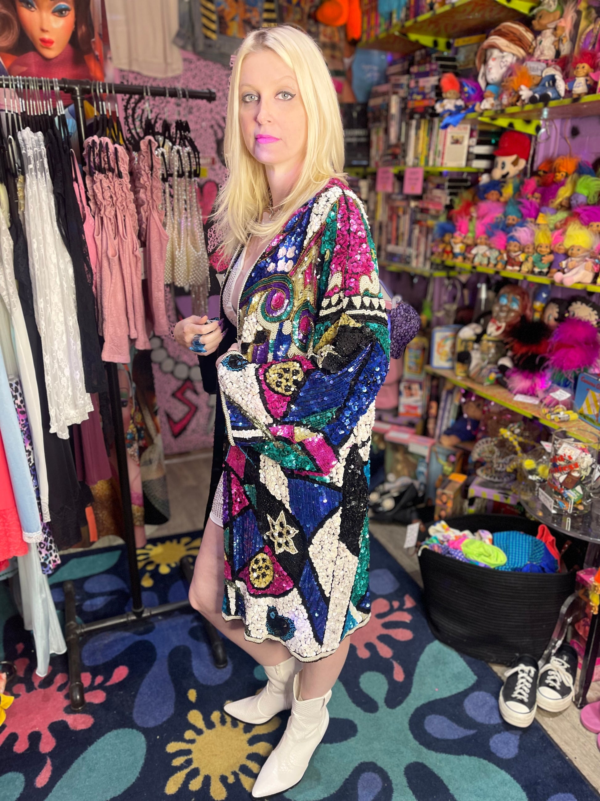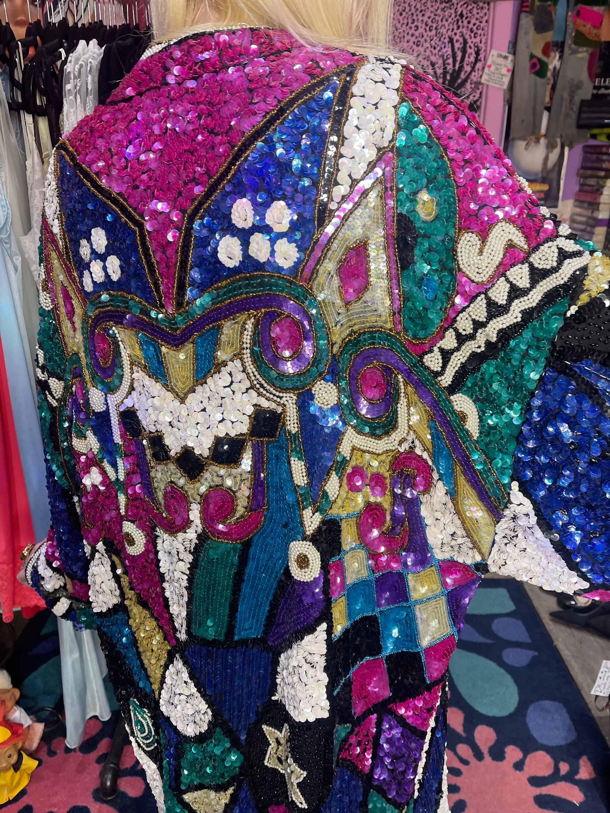 Absolutely stunning 80s kimono style jacket. 100% silk. Fully beaded and sequin encrusted with allover geometric colorful design. Open swing style construction. Heavy duty and completely stunning piece. Stands the test of time.