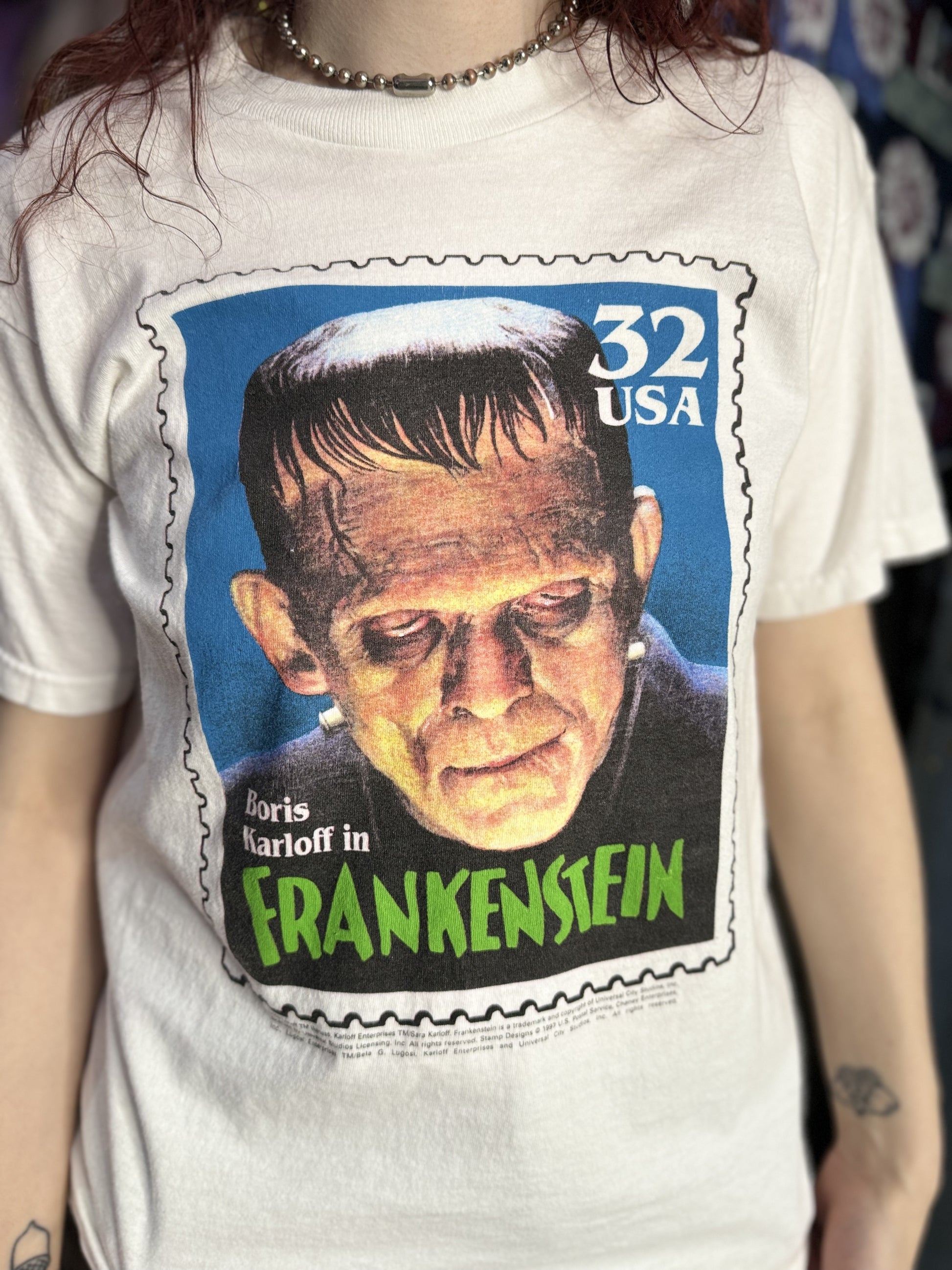 Spooky Fun 90s tee! Features portrait of Frankenstein on a stamp!