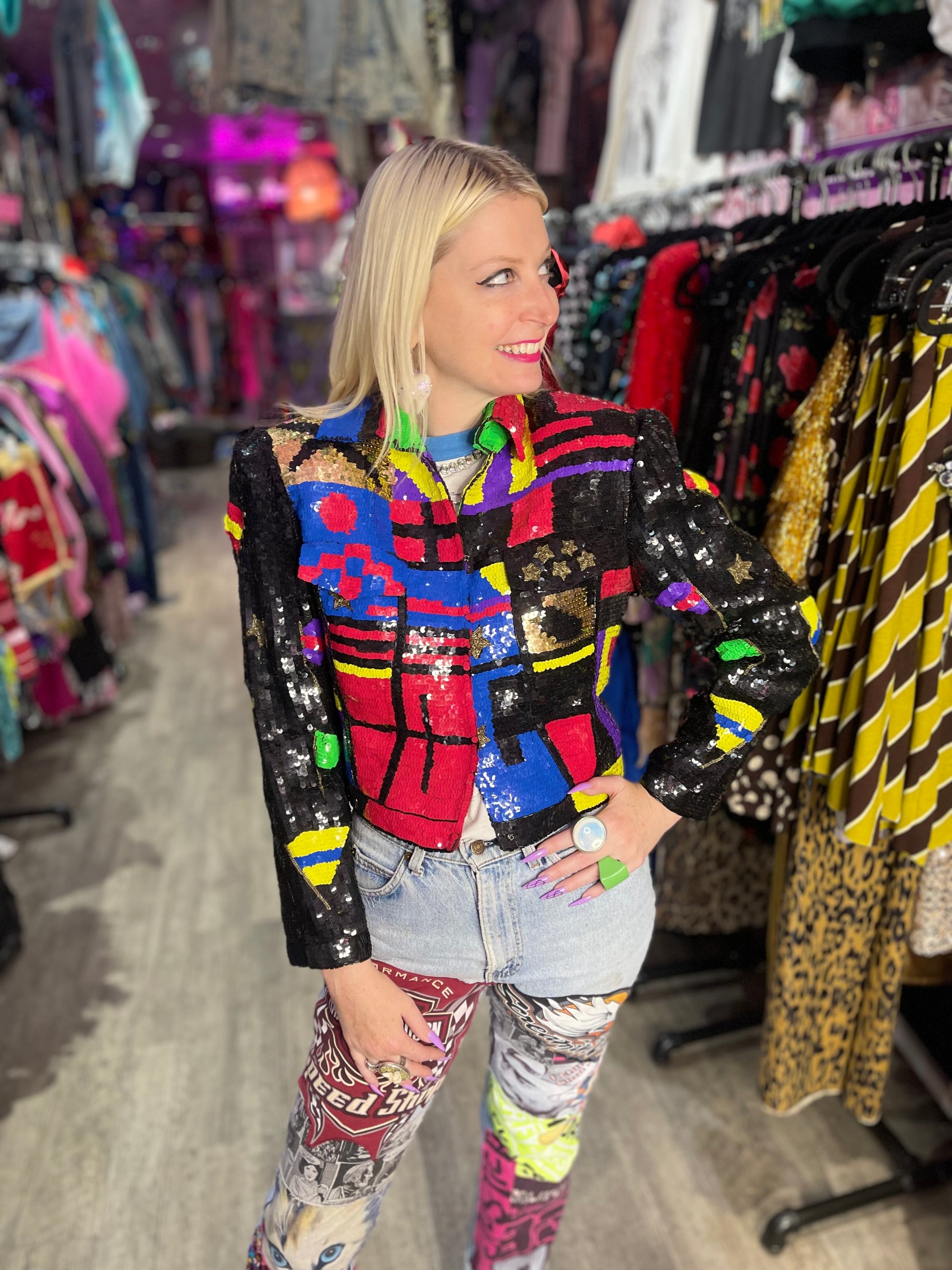 Ultra fab 90s jacket. Completely sequin encrusted. Has Allover colorful geometric squares and stars motif. Snap closure. Cropped fit. 100% Silk